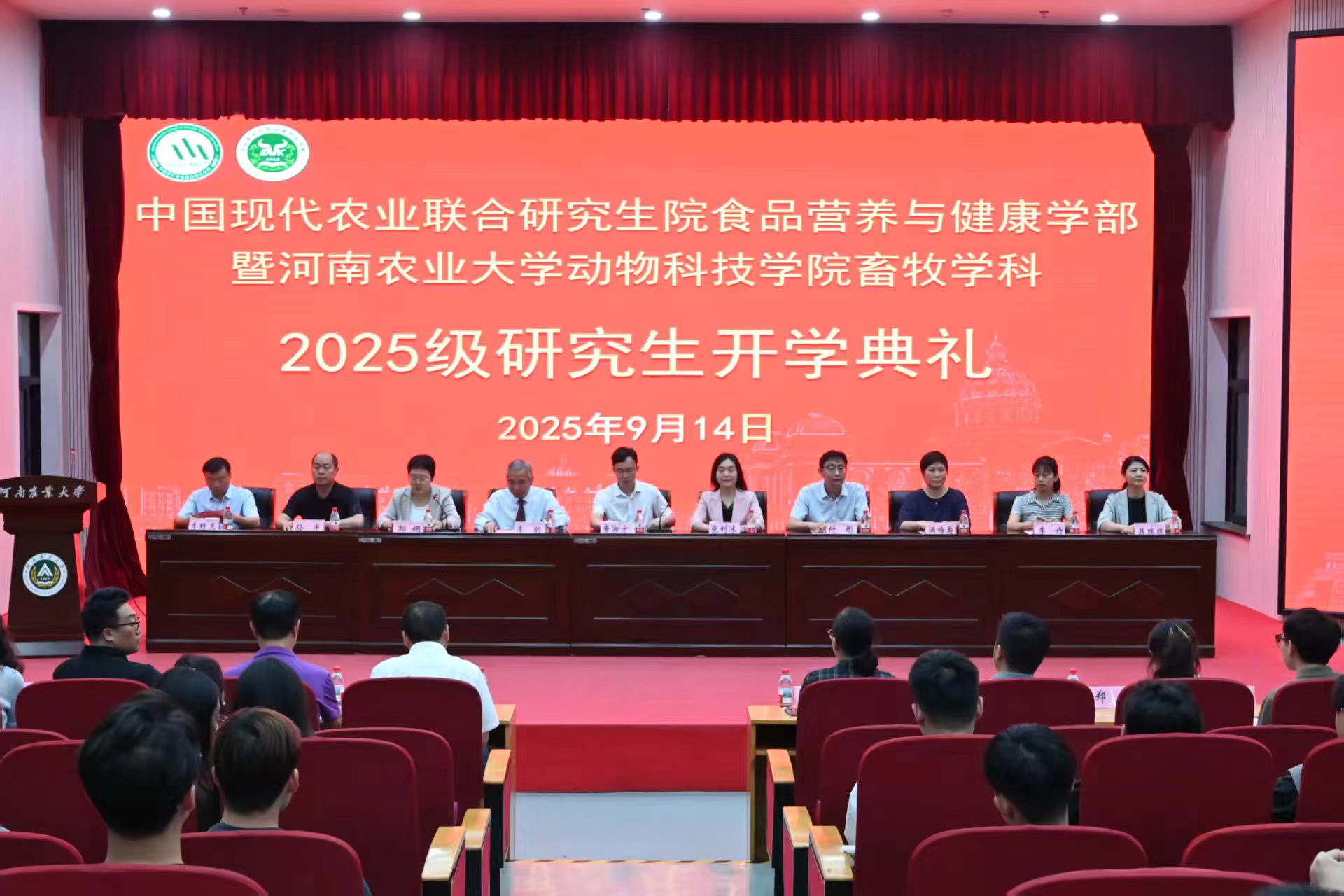 本网讯(通讯员 张红妹 王浩杰 审核 郭娟)丹桂飘香秋意浓,金风送爽启新程。9月14日晚,中国现代农业联合研究生院食品营养与健康学部畜牧学科暨河南农业大学动物科技学院2025级研究生开学典礼在龙子湖校区教学楼大教室一隆重举行。中国农业科学院北京畜牧兽医研究所副所长、智慧畜牧业创新团队首席专家、博士研究生导师唐湘方研究员,动物科技学院党委书记张利冰,学部执行主任、院长李明及学部、学院班子成员,及导师代表、新生班主任、辅导员出席典礼。典礼由动物科技学院党委副书记郭娟主持。