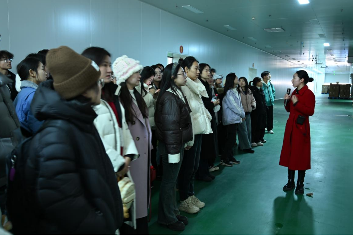在好想你公司相关负责人陪同下,师生一行深入现代化智能化生产车间,实地观摩红枣从原料筛选、清洗、分选到冻干锁鲜、去核包装的十八道精细化加工流程。车间内全自动光影分选设备、万吨级智能仓储系统和自动化生产线高效运转,师生们直观感受到科技创新赋能农业产业化的强大动能,以及企业对“一颗枣”极致深耕的工匠精神。