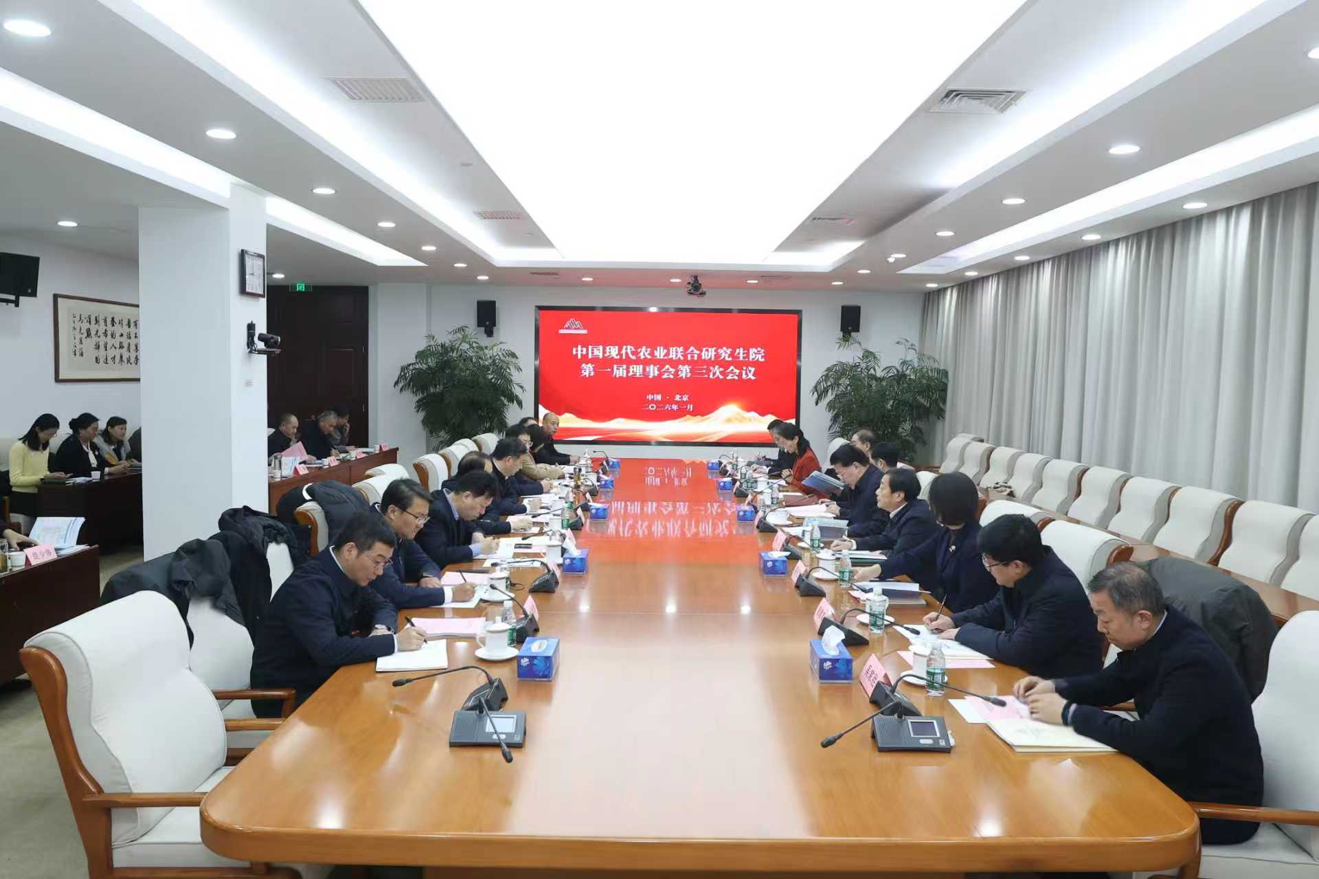 中国现代农业联合研究生院第一届理事会第三次会议听取了中国现代农业联合研究生院近一年工作进展汇报,审议通过中国现代农业联合研究生院第一届理事会成员、副理事长、理事长调整事宜以及中国现代农业联合研究生院新增11项规章制度,通报了中国现代农业联合研究生院研究生人才培养方案(修订稿)和神农创新班人才培养方案。