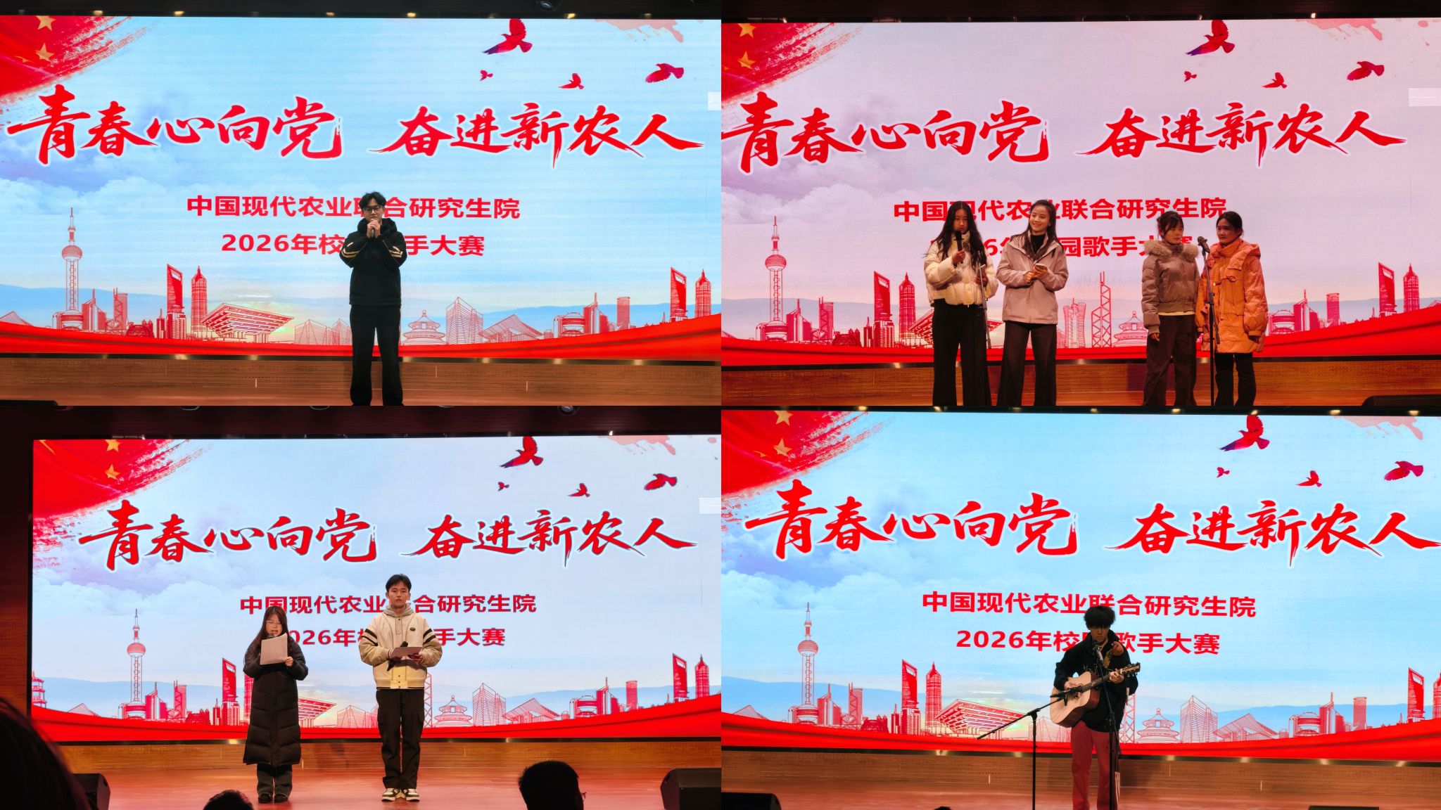 本网讯(通讯员 张琨 图片 程柯)为庆祝中国共产党成立105周年、喜迎“十五五”开局之年,进一步凝聚青春力量,助力学校“双一流”创建攻坚,深入推进融合发展,3月6日,中国现代农业联合研究生院2026年“青春心向党奋进新农人”校园歌手大赛在龙子湖校区精彩上演。神农创新班全体学生、研究生代表齐聚一堂,以歌声献礼时代,以青春告白祖国。