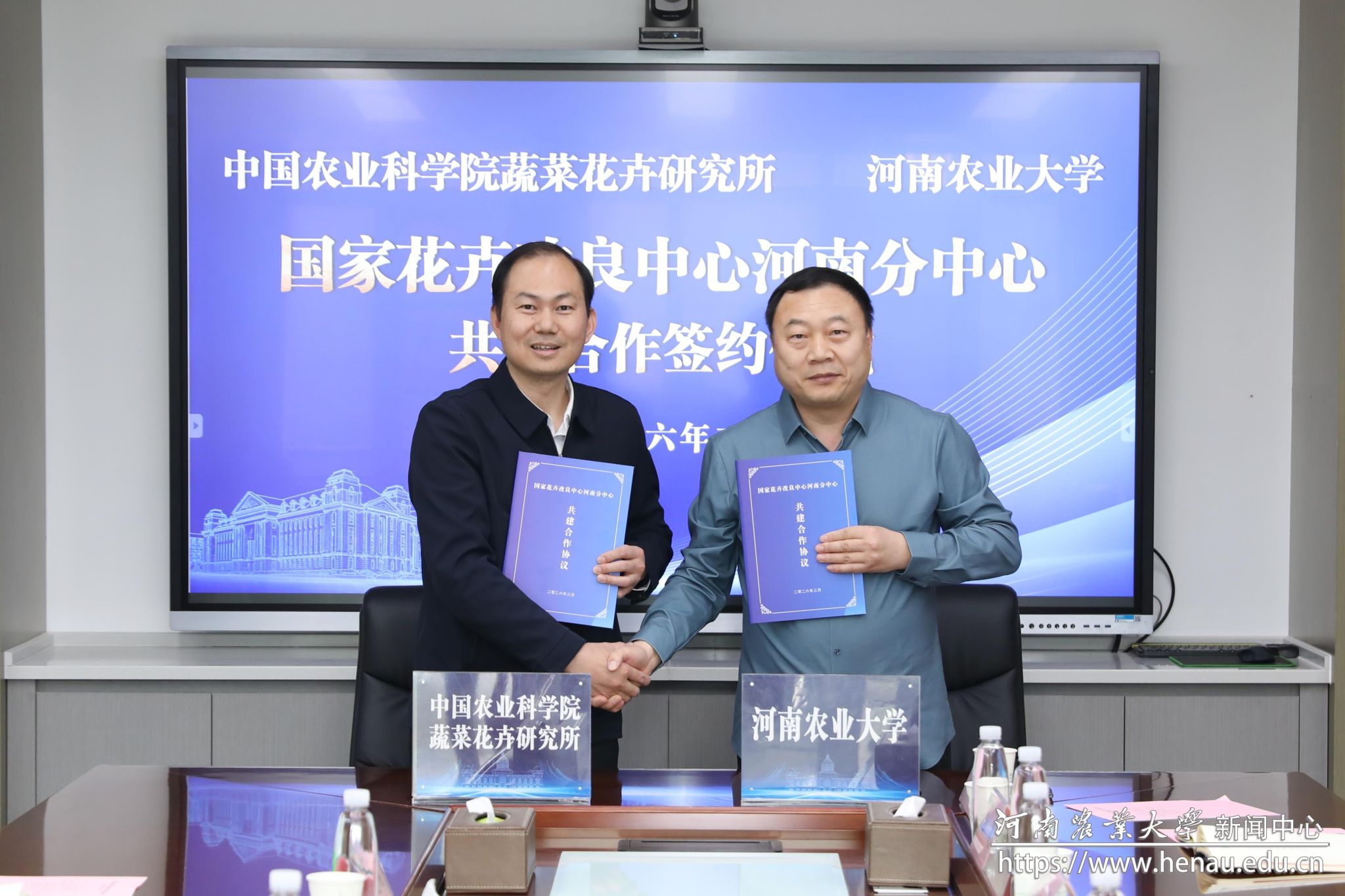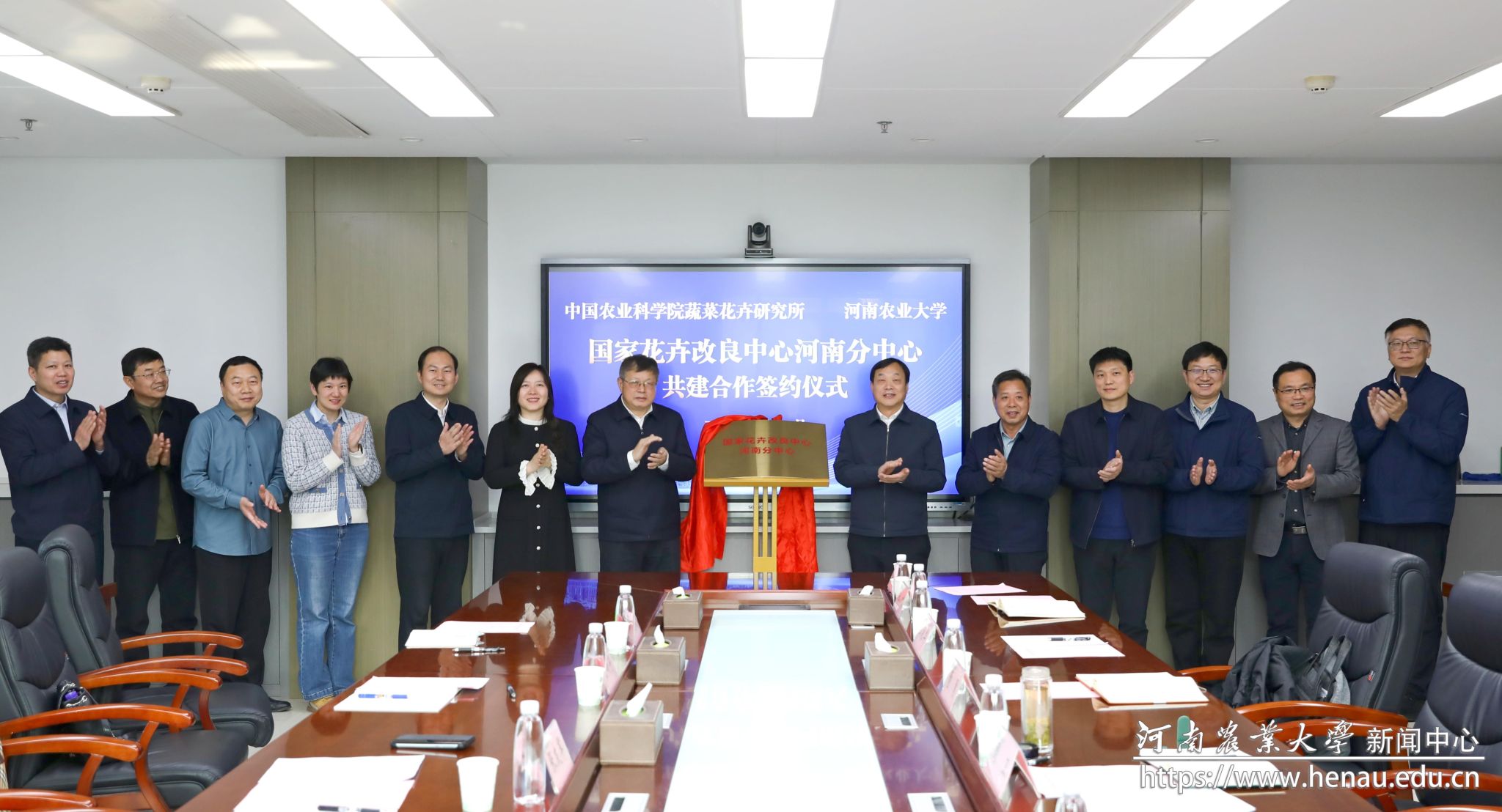会上,风景园林学院负责人与中国农科院蔬菜花卉所花卉研究室主任杨树华代表双方签订共建合作协议。周卫与张友军院士共同为国家花卉改良中心河南分中心揭牌。