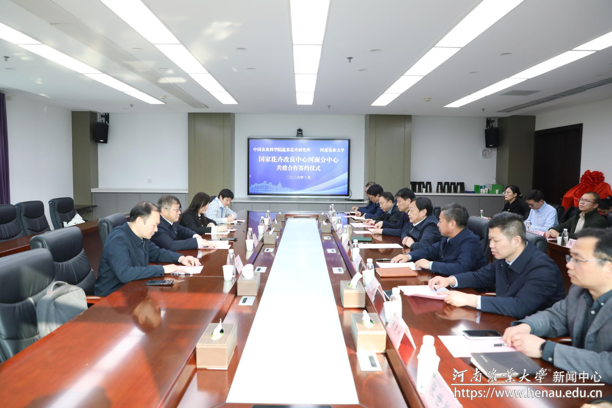 本网讯(通讯员 刘其梅 钱青秀 图片 黄璞)3月10日,学校与中国农业科学院蔬菜花卉研究所在龙子湖校区签约共建国家花卉改良中心河南分中心。中国农业科学院蔬菜花卉研究所所长张友军院士、副所长翟研宁研究员,校长周卫院士、副校长汤继华教授出席会议。中国农业科学院蔬菜花卉研究所相关负责人,学校相关职能部门、风景园林学院和园艺学院负责人及教师代表参加活动。