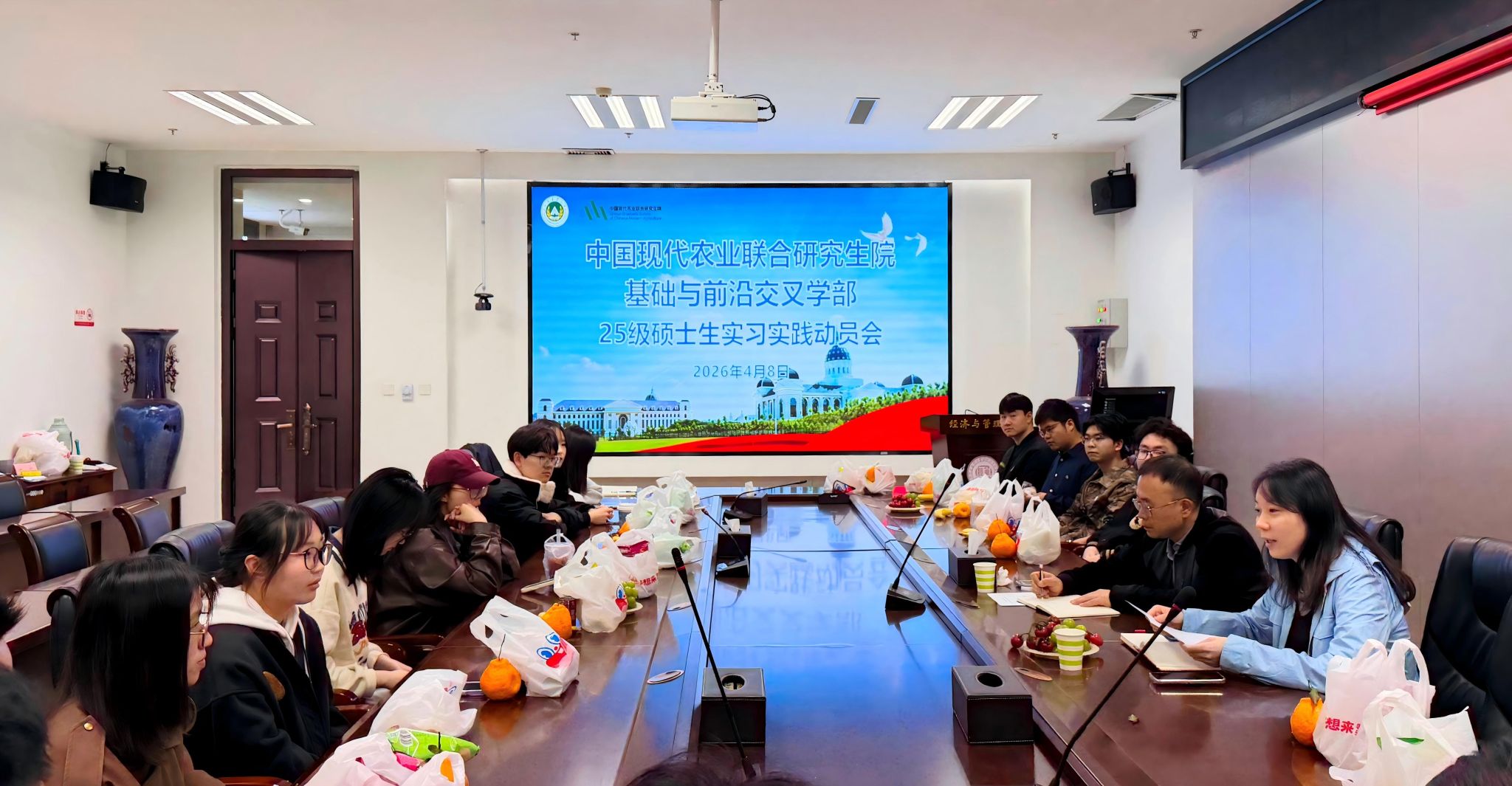 本网讯(通讯员 王雨乐 周莹)4月8日上午,基础与前沿交叉学部在龙子湖校区召开2025级硕士研究生实习实践动员会。学部副主任谢东明、经济与管理学院研究生教务负责人袁亚平及2025级全体硕士研究生参加会议。