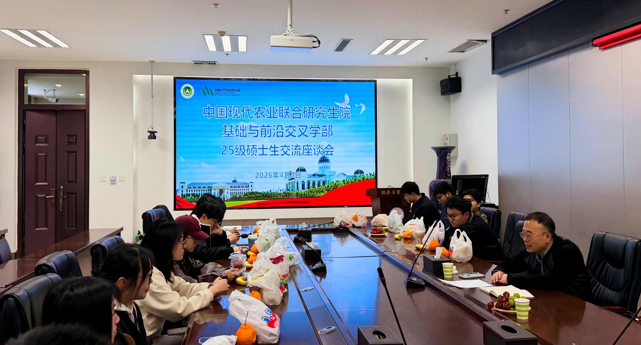 本网讯(通讯员 王雨乐 周莹)4月8日上午,基础与前沿交叉学部在龙子湖校区召开2025级硕士研究生交流座谈会。学部副主任谢东明,经济与管理学院研究生教务负责人袁亚平及2025级全体硕士研究生参加会议。