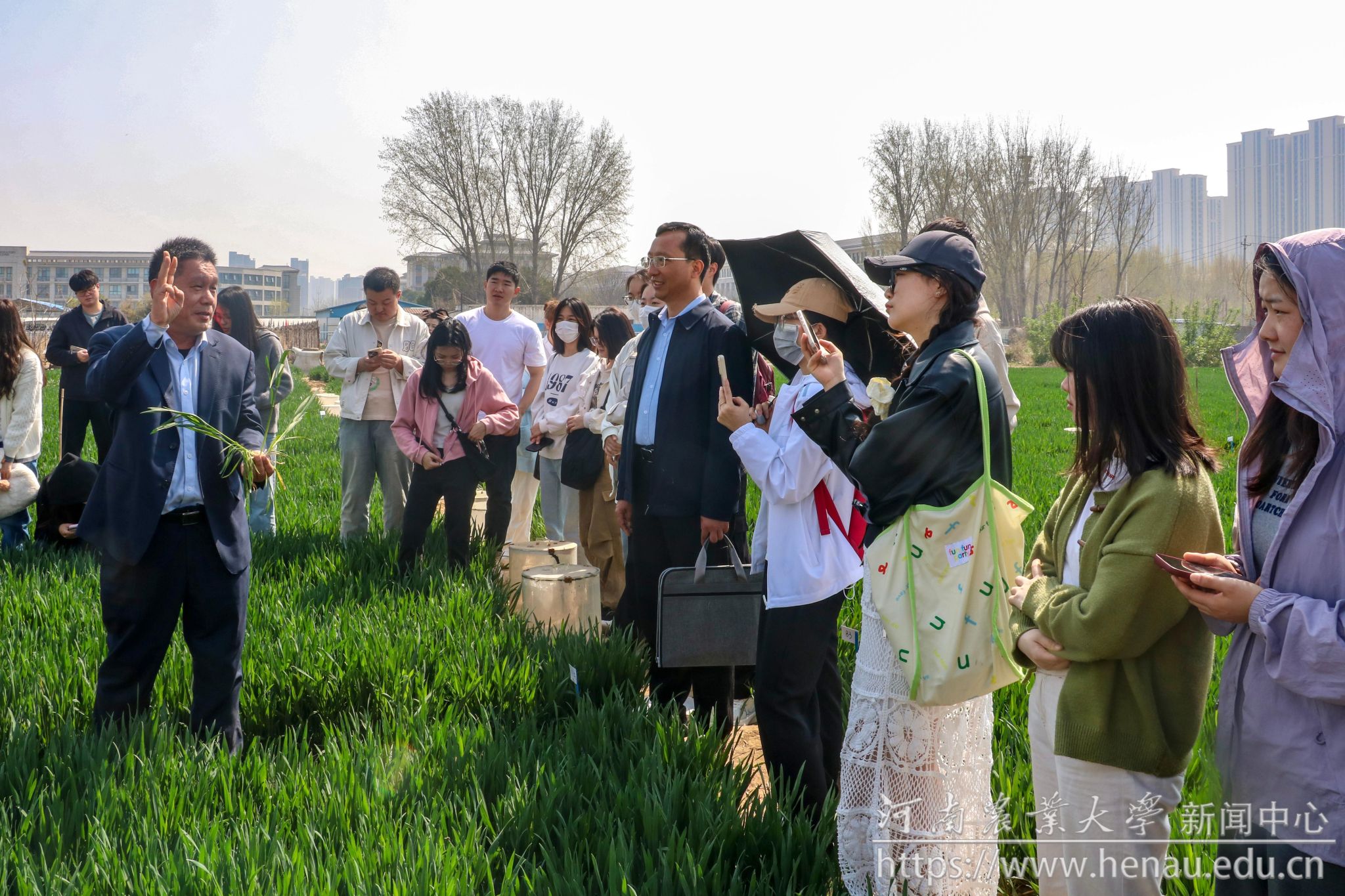 在河南农业大学科教园区,国家小麦工程技术研究中心研究员王永华带领师生走上田垄,近距离观察小麦穗秆,为师生做小麦春管的技术培训。“春分麦起身,肥水要紧跟”,王永华指出,春分是小麦管理的关键期,小麦开始返青拔节,生长速度加快,此时田间管理十分关键。王永华用生动诙谐的语言从如何预防小麦倒春寒、如何培育高产高质品种为师生展开了详细介绍。同学们由课堂理论走进田间实践,更加直观深刻地认识到了小麦生产全过程的技术要点和注意事项。
